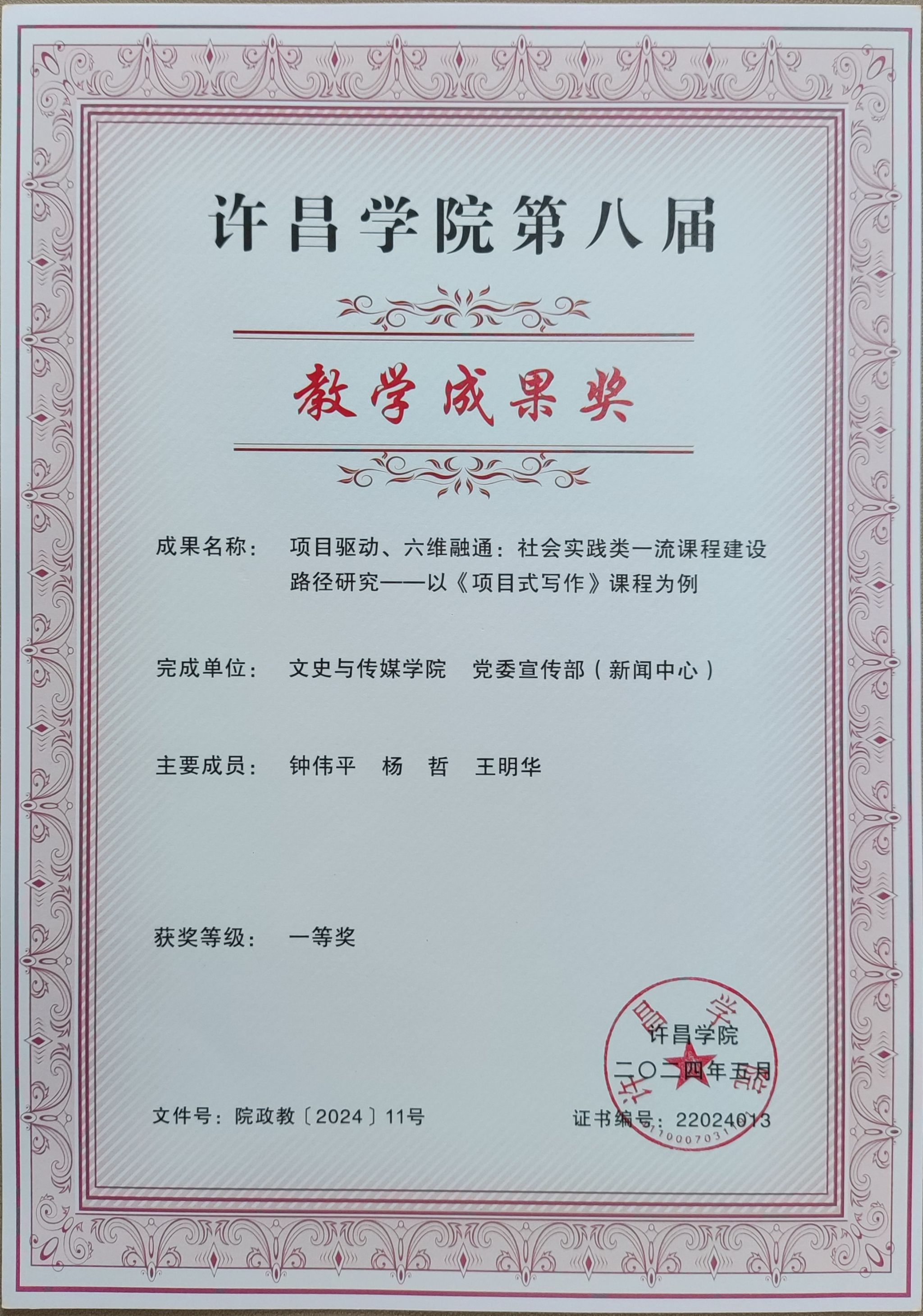 近日,许昌学院正式公布第八届校级教学成果奖评选结果(院政教〔2024〕11 号),由《项目式写作》课程组钟伟平、杨哲、王明华申报的“项目驱动、六维融通:社会实践类一流课程建设路径研究——以《项目式写作》课程为例”荣获教学成果奖一等奖。