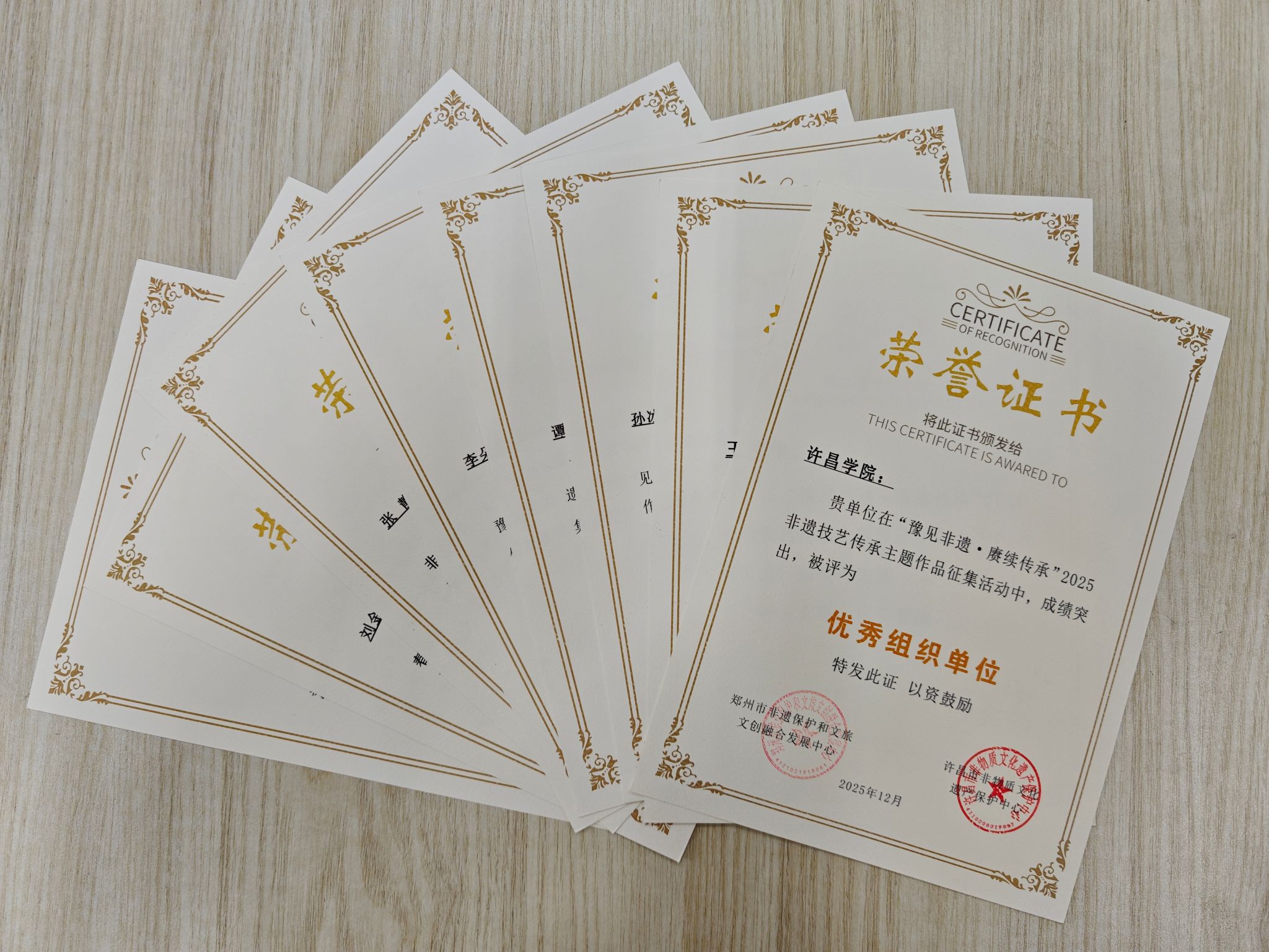 12月15日,由中原科技学院、郑州市非遗保护和文旅文创融合发展中心、许昌市非物质文化遗产保护中心联合主办的“豫见非遗・赓续传承”2025年非遗传承技艺大赛表彰大会暨成果展在中原科技学院举办。《项目式写作》(手艺河南)课程指导老师、许昌学院新闻中心副主任王明华及学生代表参加大会并现场领奖。