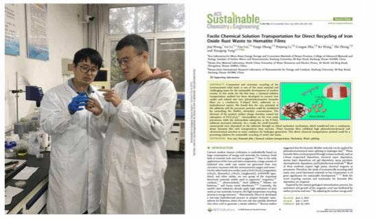 2017年9月开始,王家稷等在杨晓刚老师指导下,开始关注铁锈废弃物循环利用这一问题。他们在实验中发现利用草酸作为传输剂、以硝酸钠作为表面电荷调控剂,将铁锈通过水热法传输到FTO导电薄膜上,“变废为宝”制备得到具有(光)电活性的氧化铁薄膜,并成功应用于光电或电催化分解水制氢的阳极材料。该工作发表在ACS Sustainable Chem. Eng.期刊上,王家稷是第一作者。