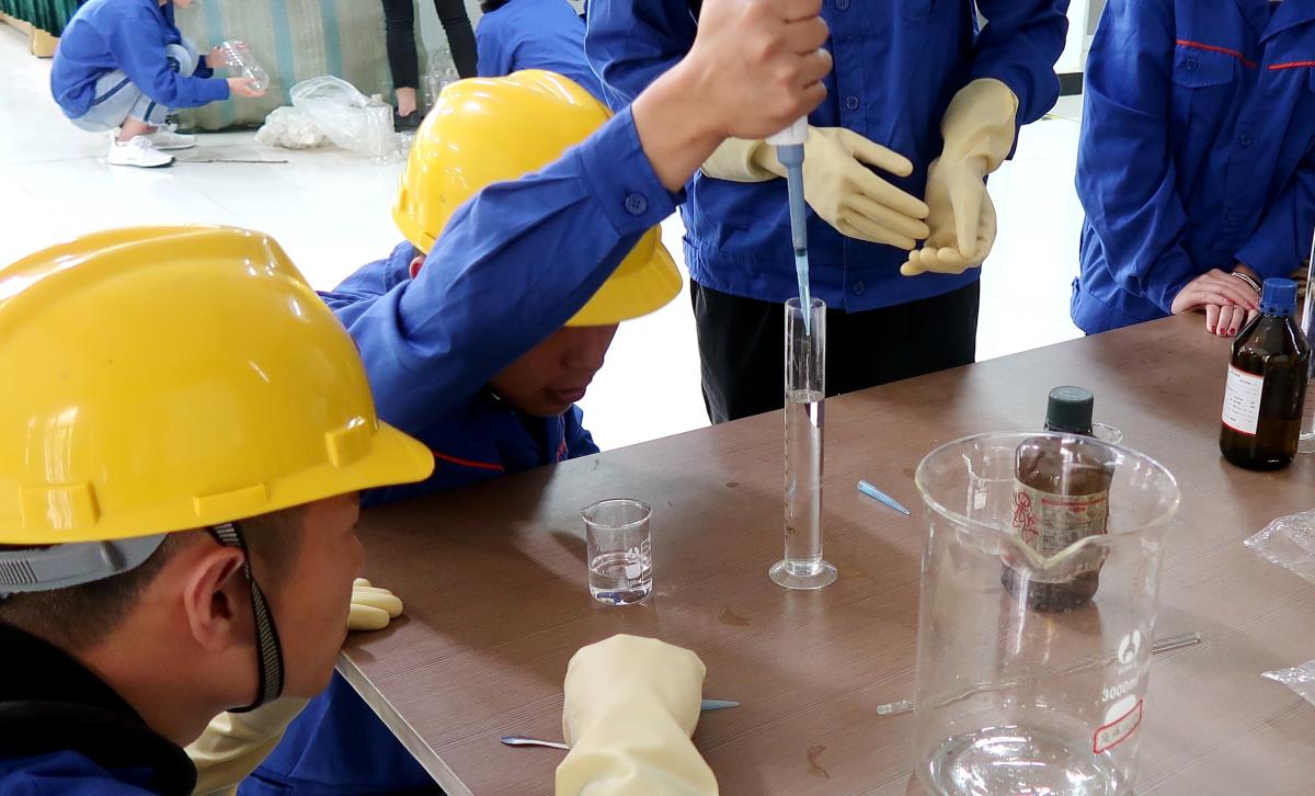 孙国富老师(左一)在化学化工学院实训中心给学生们上课