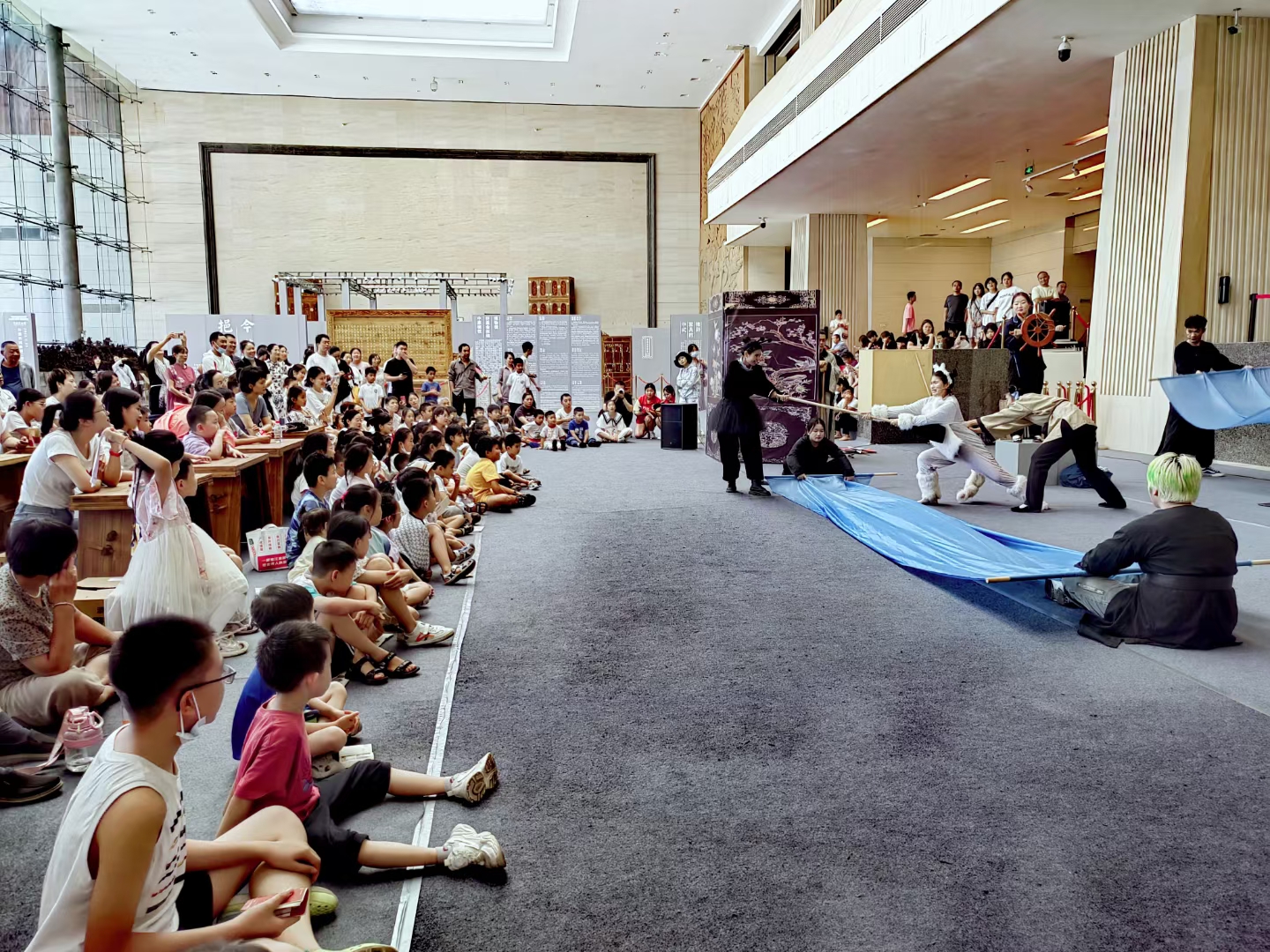 “王小二加油!王小二加油!”到了抢夺宝船的时候,现场的小朋友眉头紧锁、聚精会神,不错过演员们的一举一动,宝船夺回后,他们手舞足蹈,为剧中的角色欢呼呐喊……7月8日,在河南省许昌市博物馆,儿童剧《宝船》的演出获得了小朋友们的喜爱。